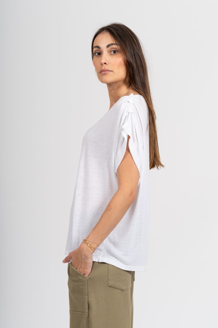 Présente un joli drapé sur les épaules, ajoutant une touche d’originalité et de féminité à cette pièce basique.